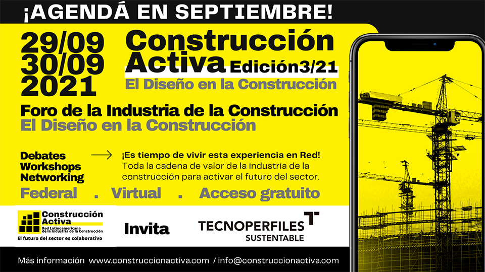 El 29 y 30 de Septiembre se llevará a cabo el próximo Foro de la Industria de la Construcción, un ciclo de debates, workshops y networking organizado por Construcción Activa, con la participación de empresas líderes del sector, profesionales, instituciones y cámaras de la industria.