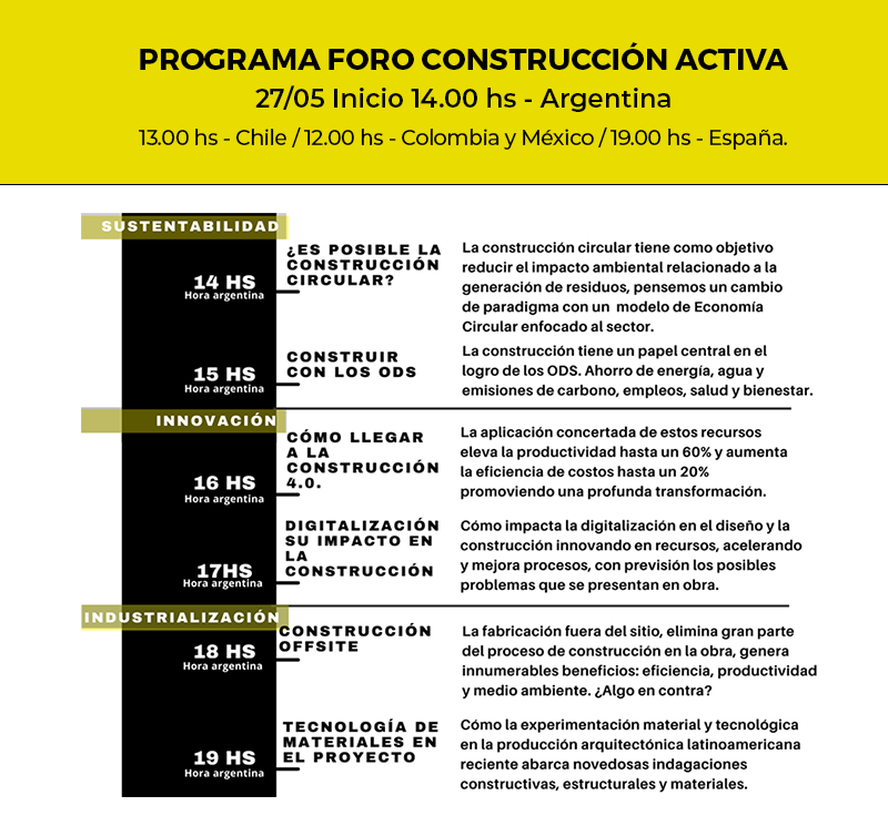 Los ejes temáticos previstos a lo largo de este 2021 en CONSTRUCCIÓN ACTIVA serán sostenibilidad, industrialización y digitalización; a desarrollar en cuatro Foros Latinoamericanos de Arquitectura y Construcción 4.0 que comienzan el próximo 27 de mayo vía streaming, a través de mesas de debate y workshops con las últimas tendencias y las claves de la nueva edificación con información actualizada para cada segmento de la industria.